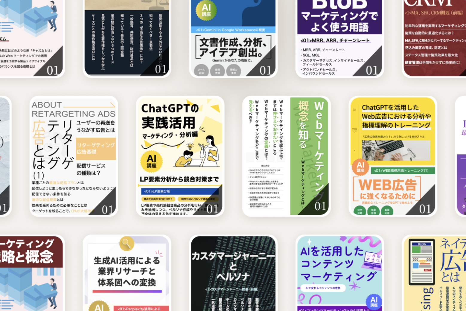 生成AIの学習を含め約1000のコンテンツをご用意。Web広告運用やアクセス解析、生成AIの活用など、実務で必要なスキルを網羅し、企業のマーケティング力・AI技術を学ぶことができます。